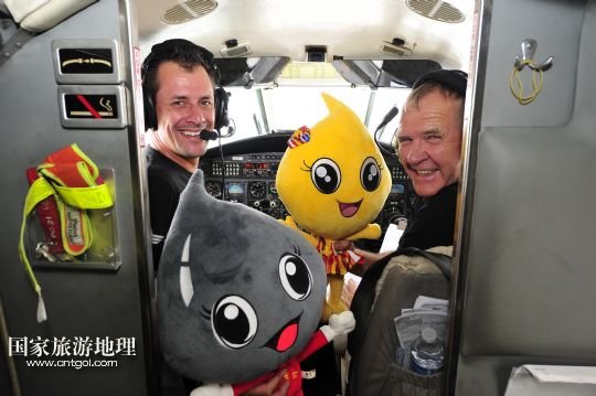8月14日,百年靈噴氣機隊保障機飛行員呂克(左)和飛行隊負責(zé)人奈杰爾(右)在飛近克拉瑪依時,揮舞克拉瑪依航空旅游節(jié)吉祥物“克拉”和“瑪依”以示慶祝。