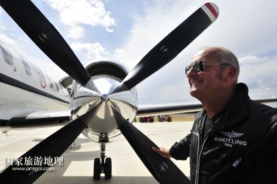 8月14日,在新疆克拉瑪依機場,百年靈噴氣機隊隊長雅克走下飛機。