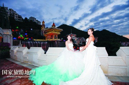 乘著電瓶車(chē),從客天下廣場(chǎng)穿過(guò)雅致的圣山湖住宅區(qū),赫然出現(xiàn)在眼前的卻是大型婚禮殿堂,純歐式的建筑群隱匿在青山綠水中:乳白色的圓形屋頂、七彩斑斕的玻璃窗、富麗堂皇的大吊燈,見(jiàn)證了一對(duì)又一對(duì)新人走進(jìn)幸福的殿堂。在充滿異域風(fēng)情的幸福里大街,蘇格蘭風(fēng)笛表演、皇家馬車(chē)、中世紀(jì)格調(diào)的咖啡館,一幕又一幕,讓人恍若時(shí)空交錯(cuò)。