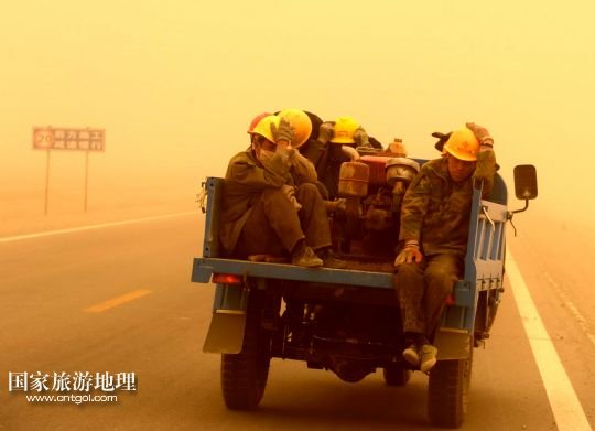 國家旅游地理 甘肅酒泉4月23日訊 4月23日,一輛拉載公路施工人員的三輪車在沙塵暴中行駛在酒泉市瓜州縣城郊的公路上。當(dāng)日,甘肅省酒泉市的敦煌市、瓜州縣等地遭受特強沙塵暴襲擊,最小能見度不足20米。當(dāng)日下午,酒泉市氣象臺發(fā)布沙塵暴紅色預(yù)警信號。 /新華社記者 聶建江 攝