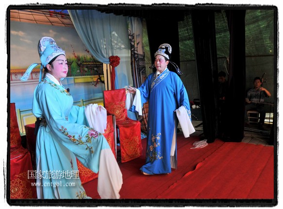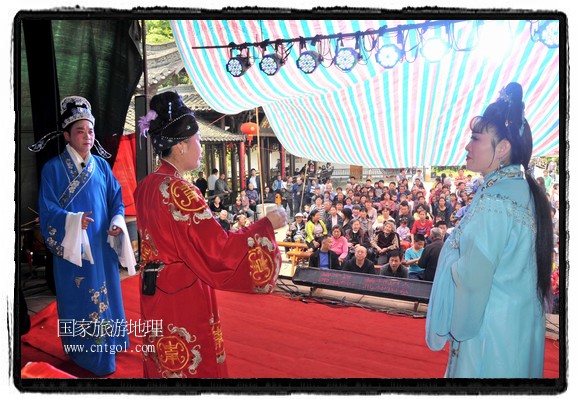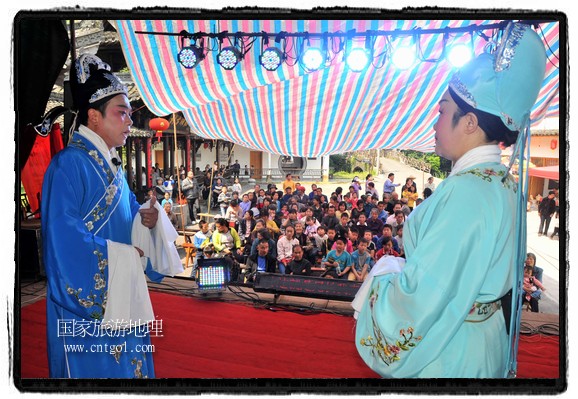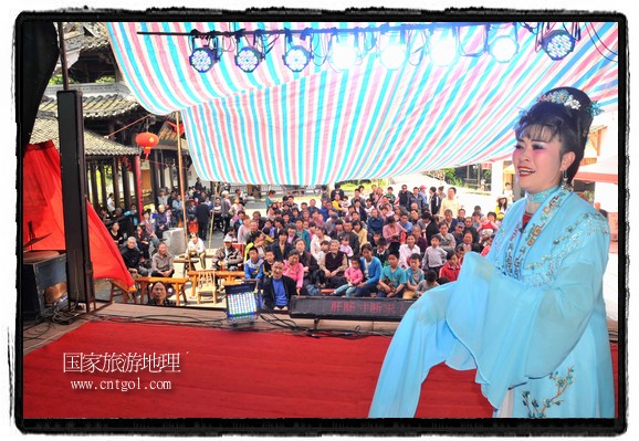 江西省婺源縣賦春鎮(zhèn)源頭村景區(qū)邀請(qǐng)了安徽黃梅戲劇團(tuán)在村門(mén)口為村民表演輪翻上演黃梅戲