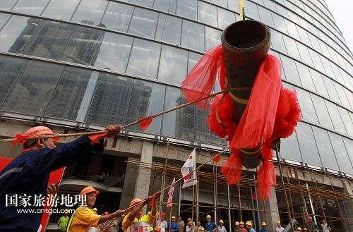 國家旅游地理 上海8月3日訊 8月3日,上海機械施工集團公司的工程人員指揮最后一榀桁架的吊裝。當日上午,隨著塔冠結(jié)構(gòu)中最后一榀鰭狀桁架緩緩起吊并安裝到位,歷時近6年建設(shè)的“上海中心”按計劃順利達到設(shè)計高度632米,刷新了“申城之巔”的新紀錄。據(jù)介紹,“上海中心”2014年年底將實現(xiàn)除酒店精裝修部分外的土建竣工,2015年年中將投入運營。新華社記者 裴鑫 攝
