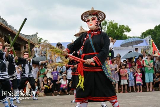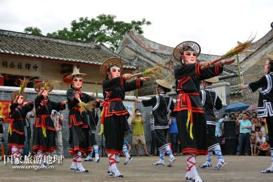 國家旅游地理 廣東云浮6月14日訊 6月13日,在廣東省郁南縣蘭寨古村,郁南縣民間藝人在表演國家級非遺郁南禾樓舞。