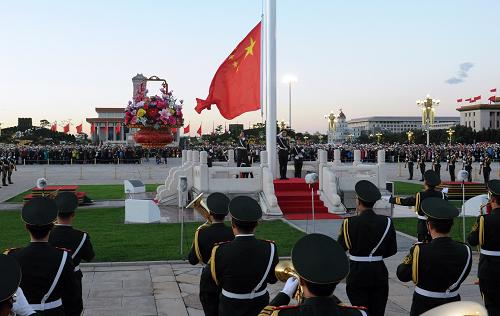 10月1日,各地群眾參加天安門廣場升國旗儀式。新華社記者 唐召明 攝