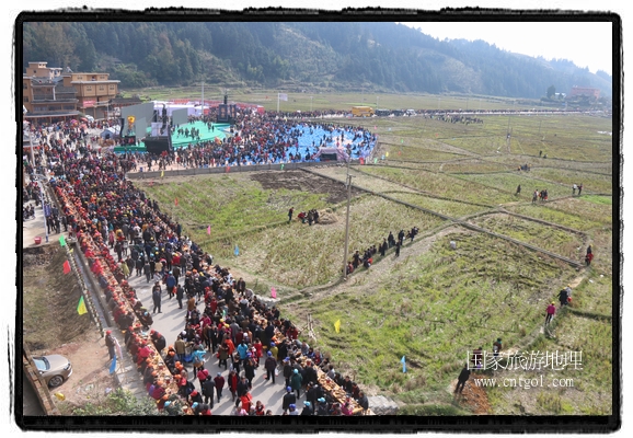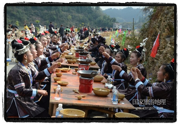 今年黎平侗年節(jié),除了延續(xù)亙古以來老百姓過侗年的各項傳統(tǒng)習俗活動外,還有“天下侗家年”大型侗族史詩情景歌舞展演、侗族萬人長桌宴、招商引資推介會、七彩田園采摘體驗、百村集市商品展銷、侗文化研討會、楊再思文化交流研討會等多項主題活動,其中,主打主推的“最大合攏宴”(萬人長桌宴)品牌,得到基尼斯紀錄總部到現(xiàn)場認定,以1700桌合攏宴,總長3.7公里,10380人同桌就餐,創(chuàng)歷史之最,成功載入《基尼斯紀錄大全》,吸引數(shù)萬旅游客到場親自見證、參與、感受和體驗這一千載難逢,氣勢恢宏的盛況。