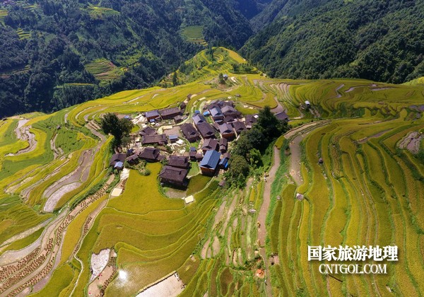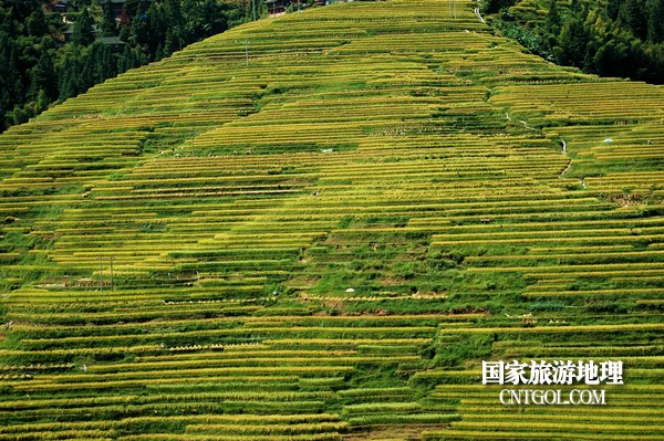 在陽(yáng)光照耀下,層層疊疊的梯田從山腳盤繞到山腰,放眼望去,金燦燦的梯田布滿山間,層層梯田,連綿起伏,拾級(jí)而上,金黃燦爛,小山如螺,大山似塔,高低錯(cuò)落。蜿蜒如春螺、披嵐似云塔,秀美如畫。