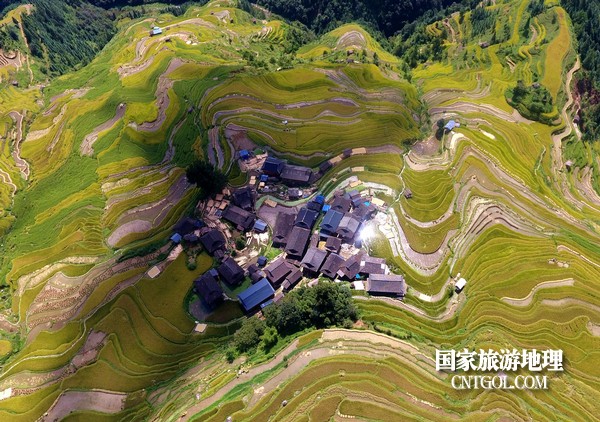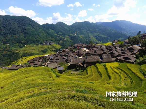 9月5日,貴州省黔東南苗族侗族自治州從江縣加榜鄉(xiāng)黨扭村和加車村近萬(wàn)畝水稻開(kāi)鐮收割。圖為:鑲嵌在田園中的苗家吊腳樓。